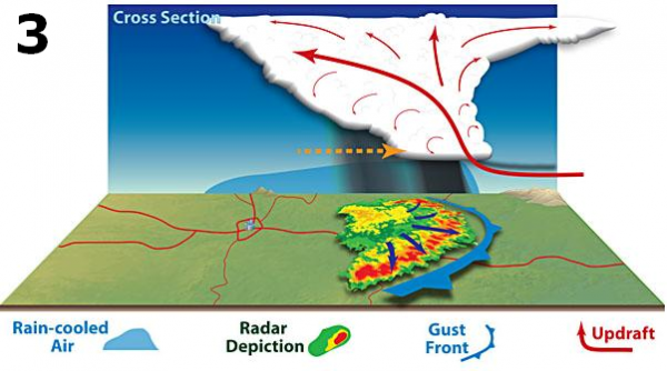 In some systems, the downdrafts in the storms can weaken the systems as cooler air pushes towards the surface and stabilizes the atmosphere. However, in this case, warm air ahead of the system can actually refuel and energize the thunderstorm complex. The downdraft winds can create a cool pool along the surface. As more storms develop, it can help strengthen and elongate the cold pool at the surface. As this happens, the cold pool induces a inflow of air known as the rear-inflow jet that helps the updraft (winds moving up) of the thunderstorm to expand and further intensify the cold pool.