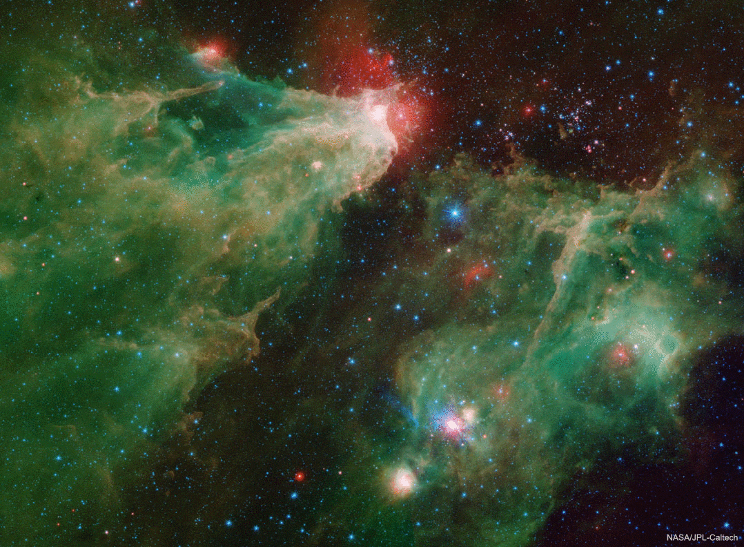 What’s happening in and around the Cave Nebula? To help find out, NASA’s orbiting Spitzer Space Telescope looked into this optically-dark star-forming region in four colors of infrared light. The Cave Nebula, cataloged as Sh2-155, is quite bright in infrared, revealing details not only of internal pillars of gas and dust, but of the illuminating star cluster too – all near the top of the image. The red glow around the Cave’s entrance is created by dust heated by bright young stars. To the right isCepheus B, a star cluster that formed previously from the same cloud of gas and dust. Other interesting stars of Cepheus come to light in infrared as well, including those illuminating an even younger nebula toward the image bottom, and a runaway starpushing a bow shock, tinged in red near the image center. This region spans about 50 light years and lies about 2,500 light years toward the constellation of the King of Aethiopia (Cepheus).
