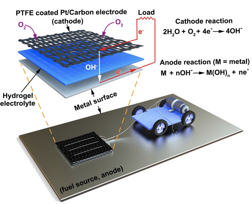 Like a traditional battery, the researchers’ MAS starts with a cathode that’s wired to the device it’s powering. Underneath the cathode is a slab of hydrogel, a spongy network of polymer chains that conducts electrons between the metal surface and the cathode via the water molecules it carries. With the hydrogel acting as an electrolyte, any metal surface it touches functions as the anode of a battery, allowing electrons to flow to the cathode and power the connected device.
