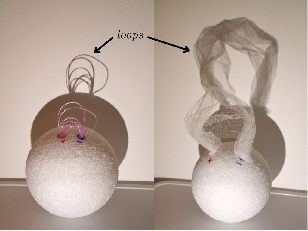 Malanushenko created a simple model to illustrate how a veil could produce the illusion of coronal loops. The shadow created against the wall represents the 2D image we see in solar telescopes. The veil’s folds and wrinkles create a pattern of darker and brighter strands, in some ways similar to the image cast by real tube-like strands.