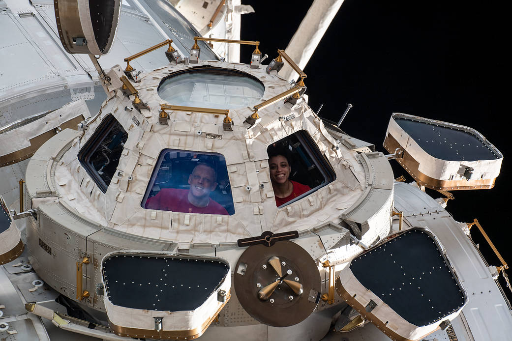 Expedition 67 flight engineers Bob Hines and Jessica Watkins are all smiles in this Sept. 12, 2022, image from the International Space Station cupola. The cupola is used to monitor the arrival of spaceships and to view the Earth.
