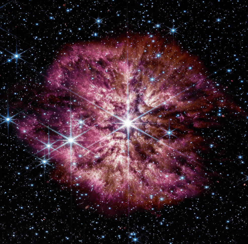 The luminous, hot star Wolf-Rayet 124 (WR 124) is prominent at the center of the James Webb Space Telescope’s composite image combining near-infrared and mid-infrared wavelengths of light from Webb’s Near-Infrared Camera and Mid-Infrared Instrument.