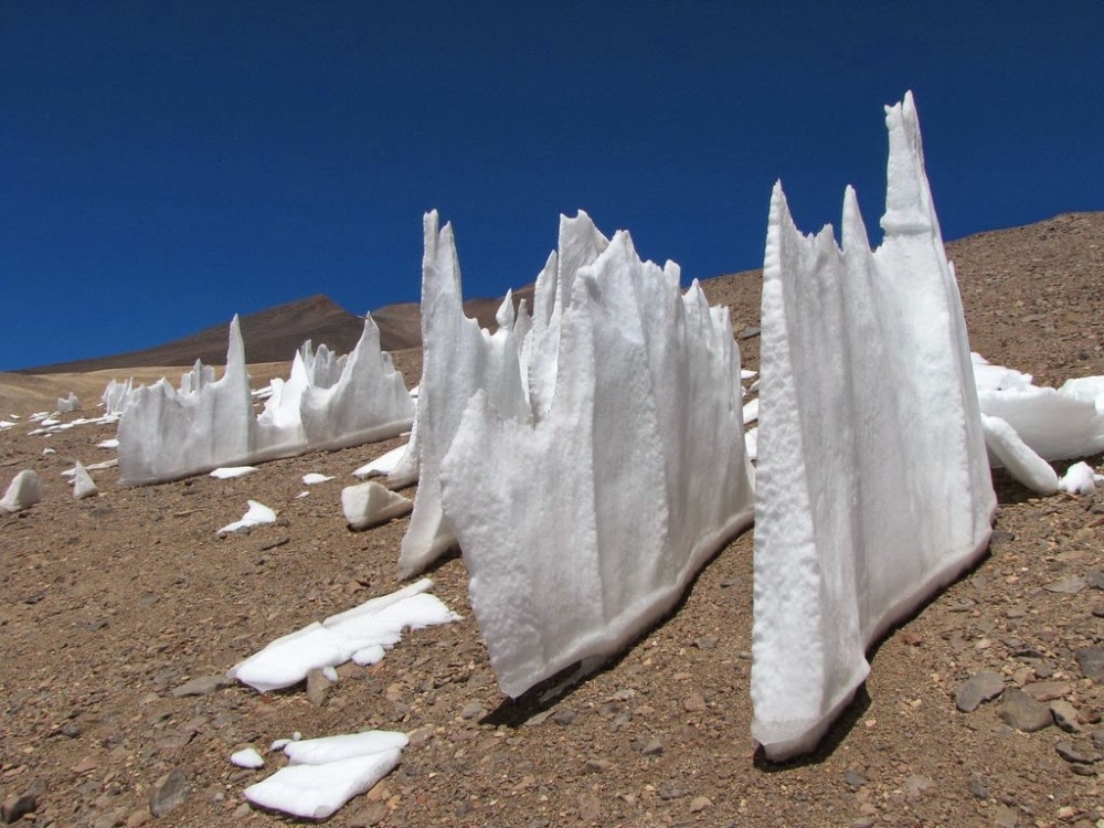 These ice spikes, called penitentes, form in high altitudes, where sunlight turns ice directly into water vapor, rather than melting it to water. Sun beams vaporize small dimples in the snow's surface. Then, the uneven surface directs sun into the... Continue Reading →