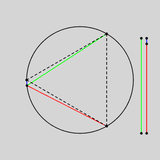 For a cyclic quadrilateral, the sum of the products of the two pairs of opposite sides equals the product of the diagonals. We have three colored segment in this animation. Surprisingly the length of the longest one is always the sum... Continue Reading →