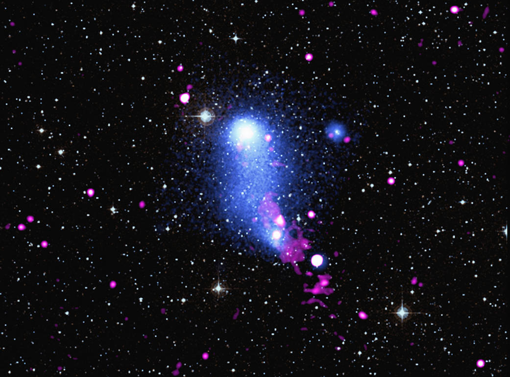 Several hundred million years ago, two galaxy clusters collided and then passed through each other. This mighty event released a flood of hot gas from each galaxy cluster that formed an unusual bridge between the two objects. This bridge is now being pummeled by... Continue Reading →
