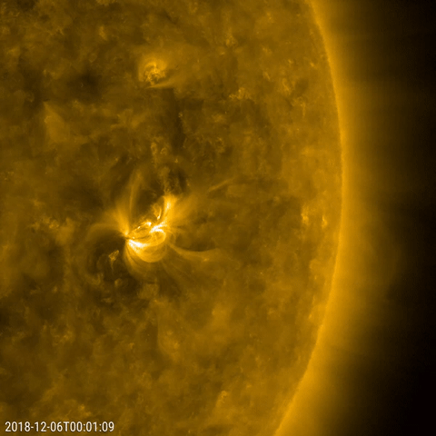 The only active region observed this week appeared on Dec. 5, 2018 and grew into an average size display of dynamic activity (Dec. 6-7, 2018). As viewed in a wavelength of extreme ultraviolet light, the region presented numerous magnetic loops... Continue Reading →
