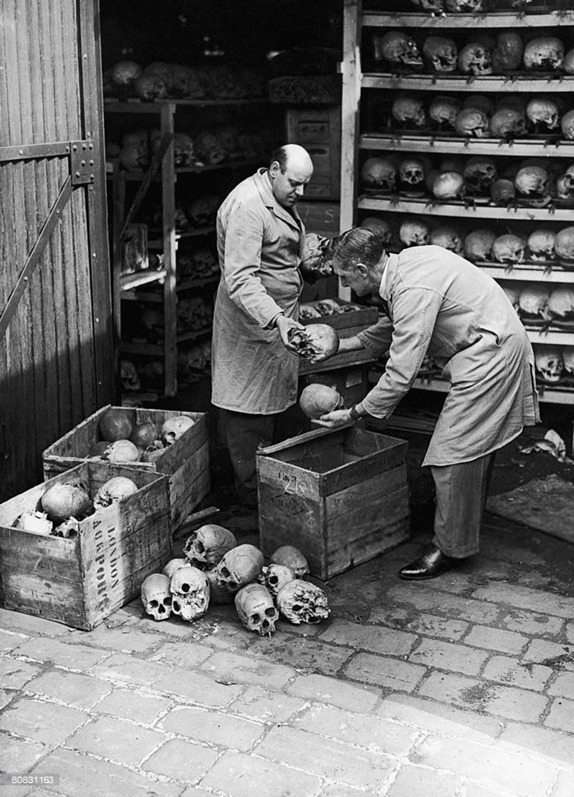 Attendants from the Hunterian Museum of the Royal College Of Surgeons packing up some of the 3,000 human skulls stored in a shed in Lincoln’s Inn Fields, London, before their transfer to the Natural History Museum, July 1, 1948. The... Continue Reading →